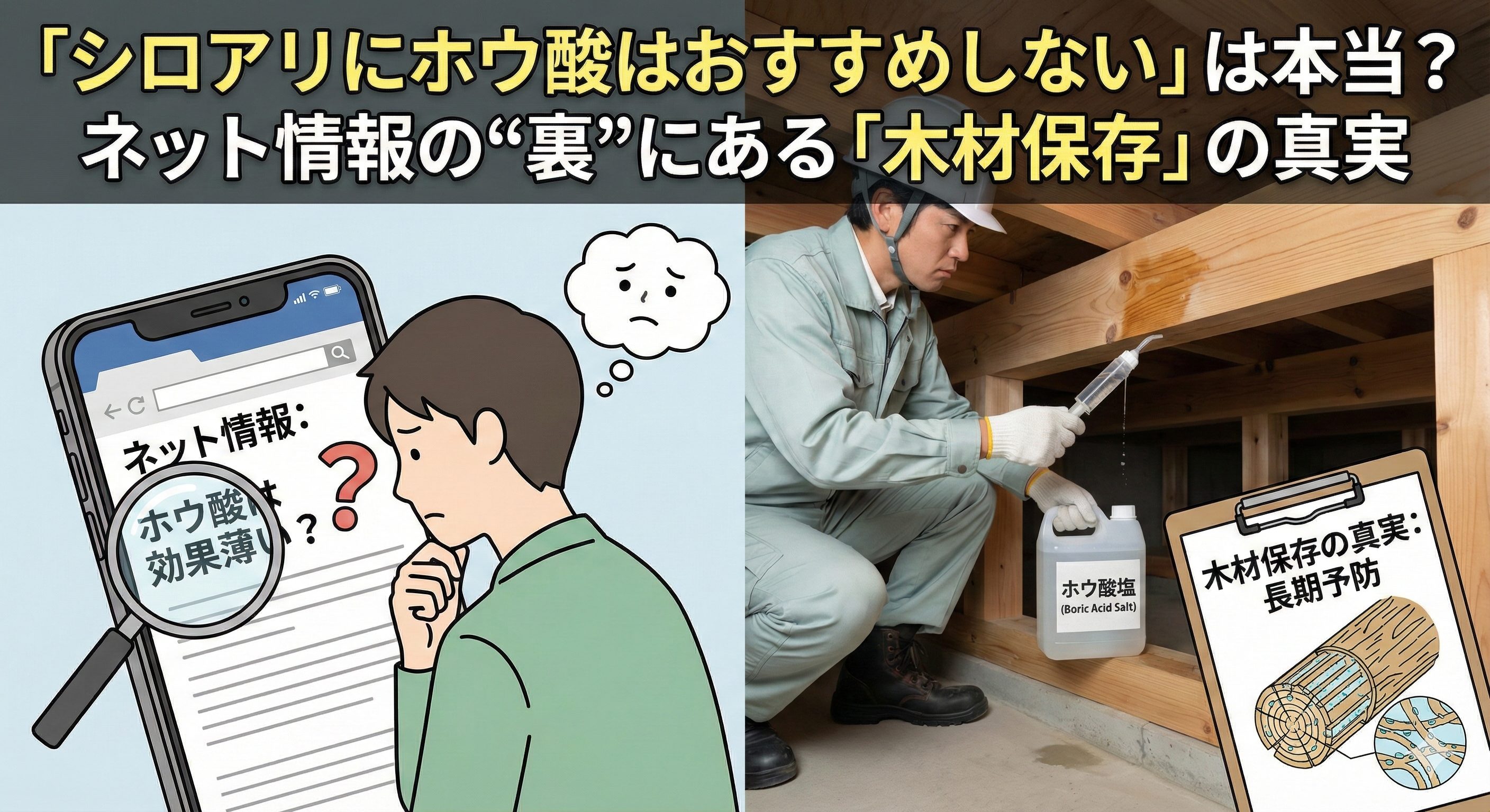 シロアリ対策について調べると、「ホウ酸は効くのが遅い」「日本しろあり対策協会認定ではない…
